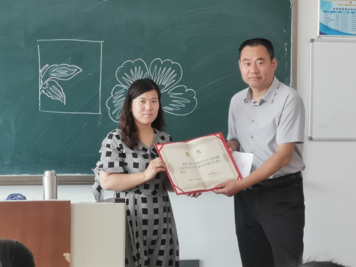 讲座后,文学与新闻传播学院相关负责人为石万照老师颁发了兼职教师的聘书。