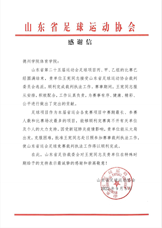 近期,威尼斯官网收到了来自山东省足球运动协会的一封感谢信。信中,省足协对威尼斯官网体育学院王宪老师在山东省第二十五届运动会足球项目期间所表现的积极态度、良好的精神面貌和裁判执法工作给予了充分肯定。