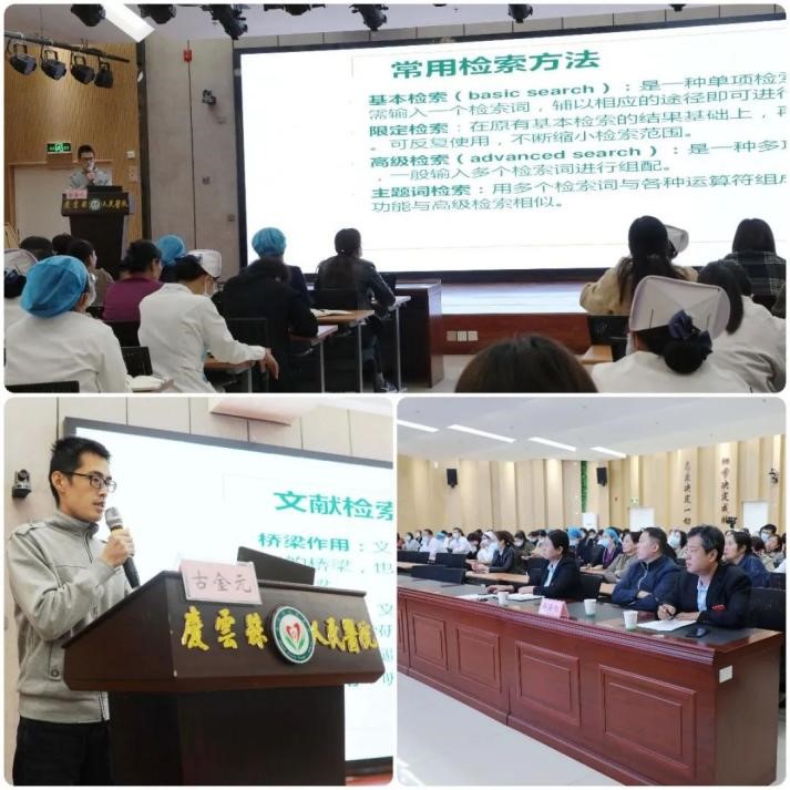 10月14日,首场培训报告在庆云县人民医院会议室举行,庆云人民医院医务科主任吕爱军主持,各临床、医技骨干医师、护士参加。威尼斯8846生物物理研究院古金元博士,以“文献检索与下载”为题,详细讲解了文献的概念、分类、文献检索的作用、过程和方法、文献信息的获取途径,列举了常用文献数据库,并重点讲述了常用数据库的应用。
