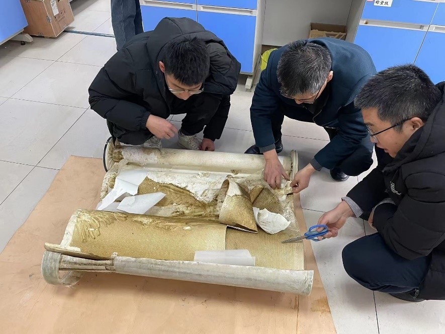 2月15日下午,山东天庆科技发展有限公司一行4人由副总经理赵继光带队,携带一支在污水处理工程现场被严重污堵的反渗透膜元件,来到生物物理研究院与李强教授共同探讨分析膜元件产生污染的具体原因,同时确定了膜表面污染物分析方案并对污染后的反渗透膜在分离膜实验室进行了现场测试,经过近三个小时的探讨分析,问题行到圆满解决,达到了公司来访目的。